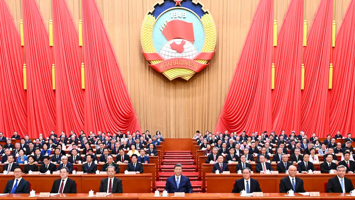 3月4日下午,中国人民政治协商会议第十四届全国委员会第四次会议在北京人民大会堂开幕。中共最高权力核心、中央政治局常委习近平、李强、赵乐际、蔡奇、丁薛祥、李希、韩正在主席台就座。(新华社)