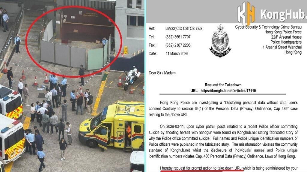 就见习女督察2月时在警署内自轰身亡(左图),香港警方要求一个境外网站下架相关报道(图右)。2026年3月16日 © KongHub脸书截图及网上资料图片