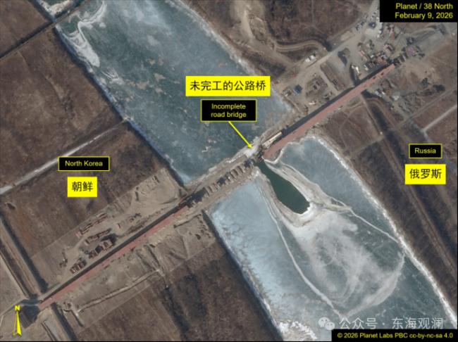2026年2月9日拍摄图片显示,连接朝鲜和俄罗斯的图们江公路桥尚未完工