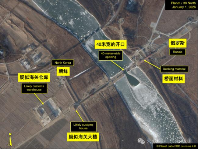 2026年1月卫星影像显示,图们江公路桥基础施工进展顺利。朝俄两边的施工方采取临时拦河方式,暂时使用土方围堰阻断了约300米的河段,仅保留40米宽开口供河水通过;大桥面板材料已准备就绪,等待安装和相关基础设施的建设。