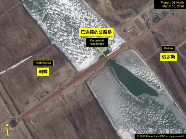 据近日报道,最新卫星影像显示,朝鲜和俄罗斯新建图们江公路大桥工程取得重要进展,两岸桥体施工已在桥中央汇合,大桥桥面即将合拢。