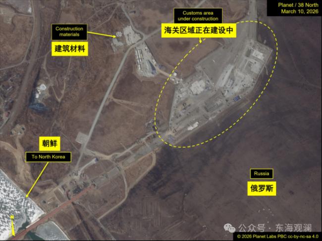 2026年3月10日拍摄的图们江公路桥俄罗斯一侧正在建设中的海关区域,和图们江公路桥朝鲜一侧的特写图像