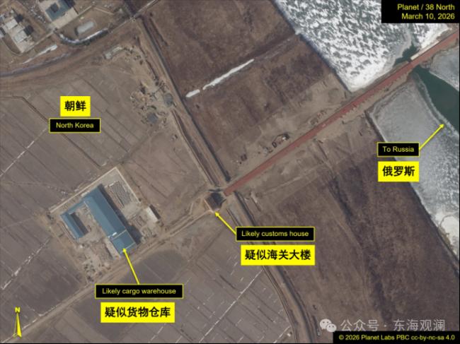 3月10日卫星影像图显示,俄方一侧正在大桥陆地延伸处扩建大型海关监管区;朝鲜一侧的大桥陆地延伸处则新建一座疑似海关大楼,附近同时新建一处大型货运仓储设施。