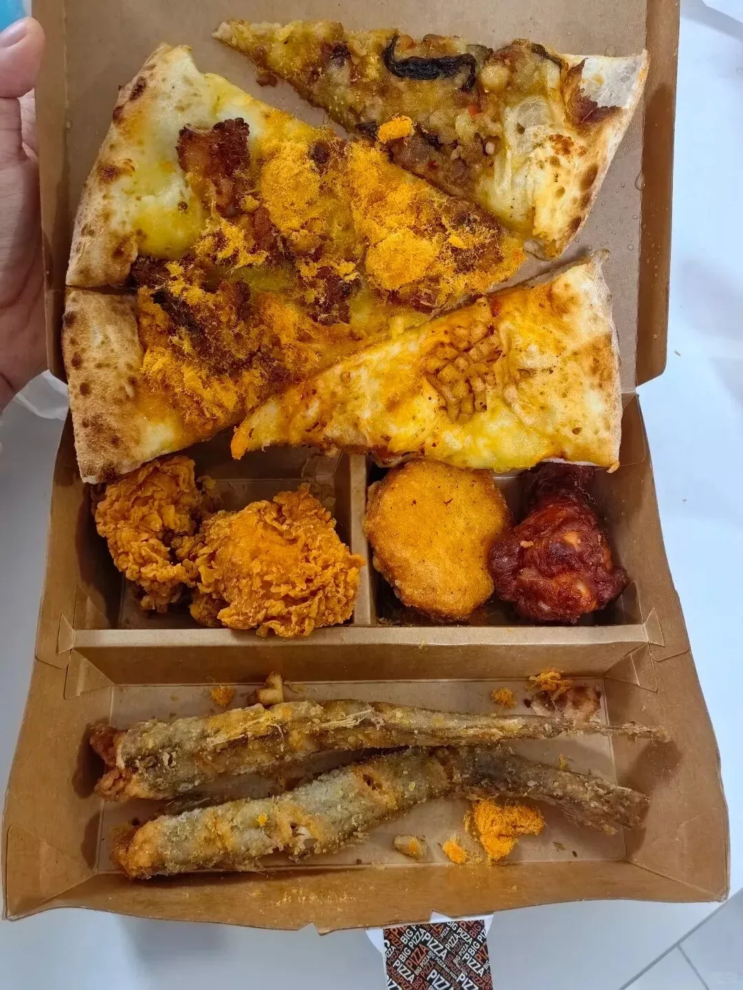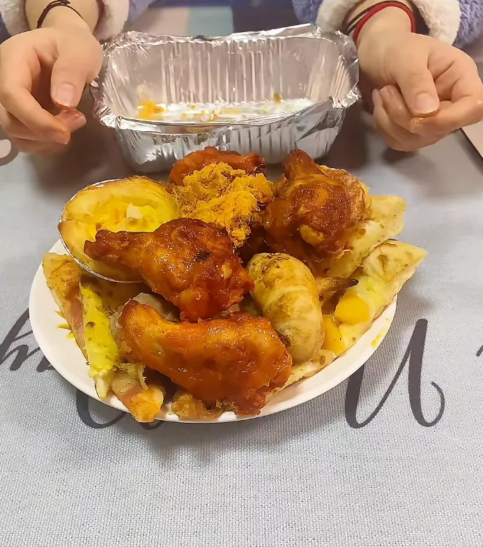 还有人12块9买来两大盒炸鸡、披萨,掏出来的食物堆满了盘子,足够两个人吃了。