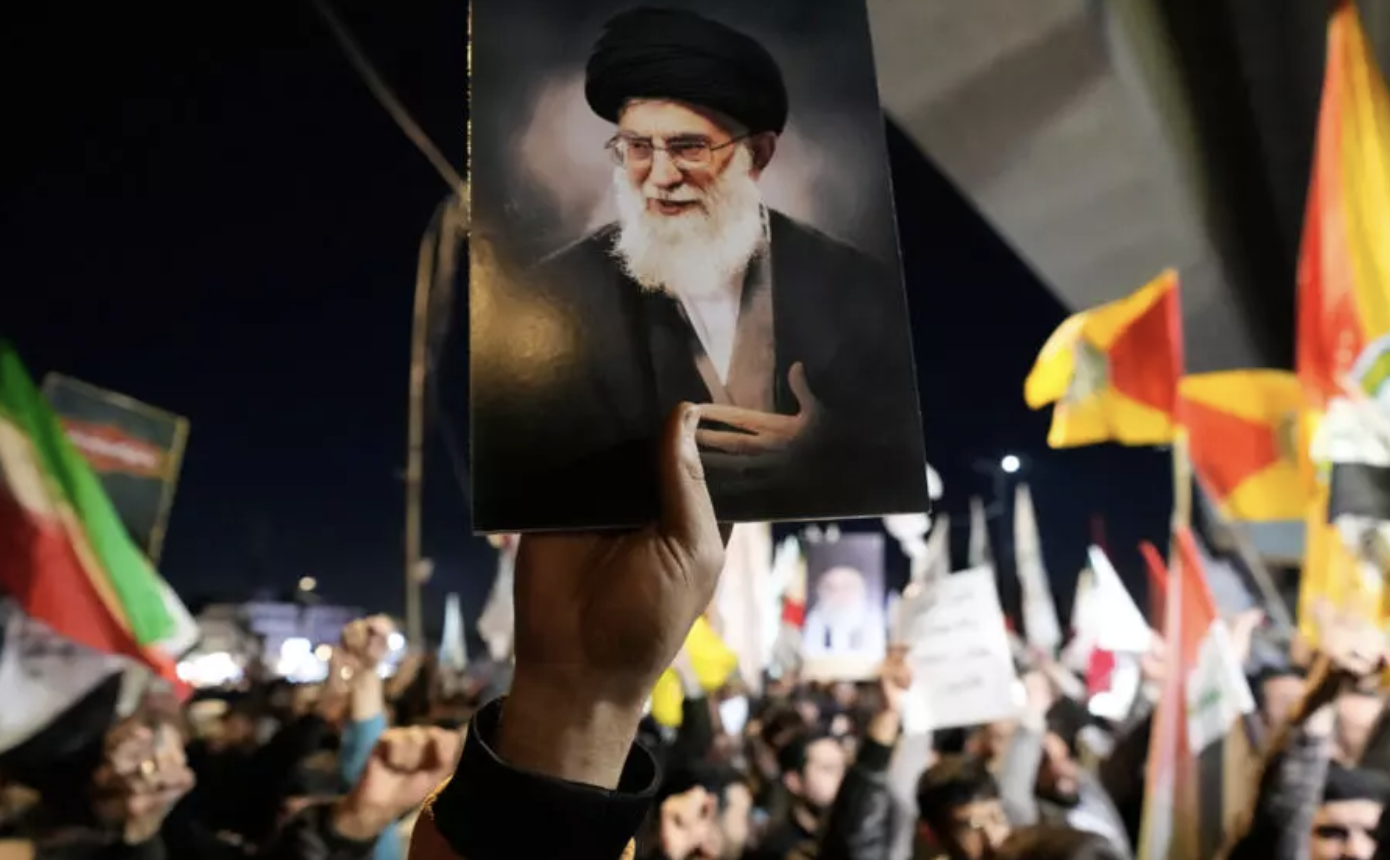 一名抗议者举着伊朗最高领袖阿亚图拉·阿里·哈梅内伊的画像 2026年2月28日星期六伊拉克巴格达 © AP - Hadi Mizban