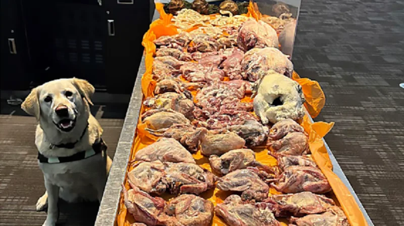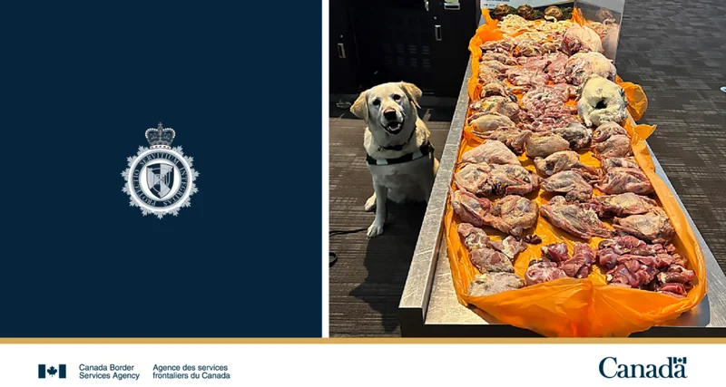 CBSA向CP24透露,3月8日,警犬 Dharla 对该旅客作出“指示”,发现其携带生鸭肉、鸽肉、鸡肉和兔肉,总重量达22.5公斤。