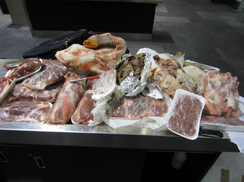这些生肉包括部分冷冻牛肉、整只鹅以及其他较小的禽类,都是在一只警犬Scout在第一航站楼行李转盘上发出提示后发现的。随后,这些行李被带到二次检查区进行进一步检查,并在其中发现了这些生肉。旅客随后被告知,入境加拿大必须申报所有食品、植物、动物及相关产品,这些肉类则被没收并销毁。