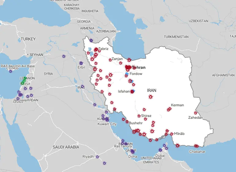 截止3月3日,美以轰炸地点(红色)、伊朗复仇打击点(紫色),绿色为以色列打击黎巴嫩,蓝色为2025年美国轰炸伊朗境内的核设施 CBS