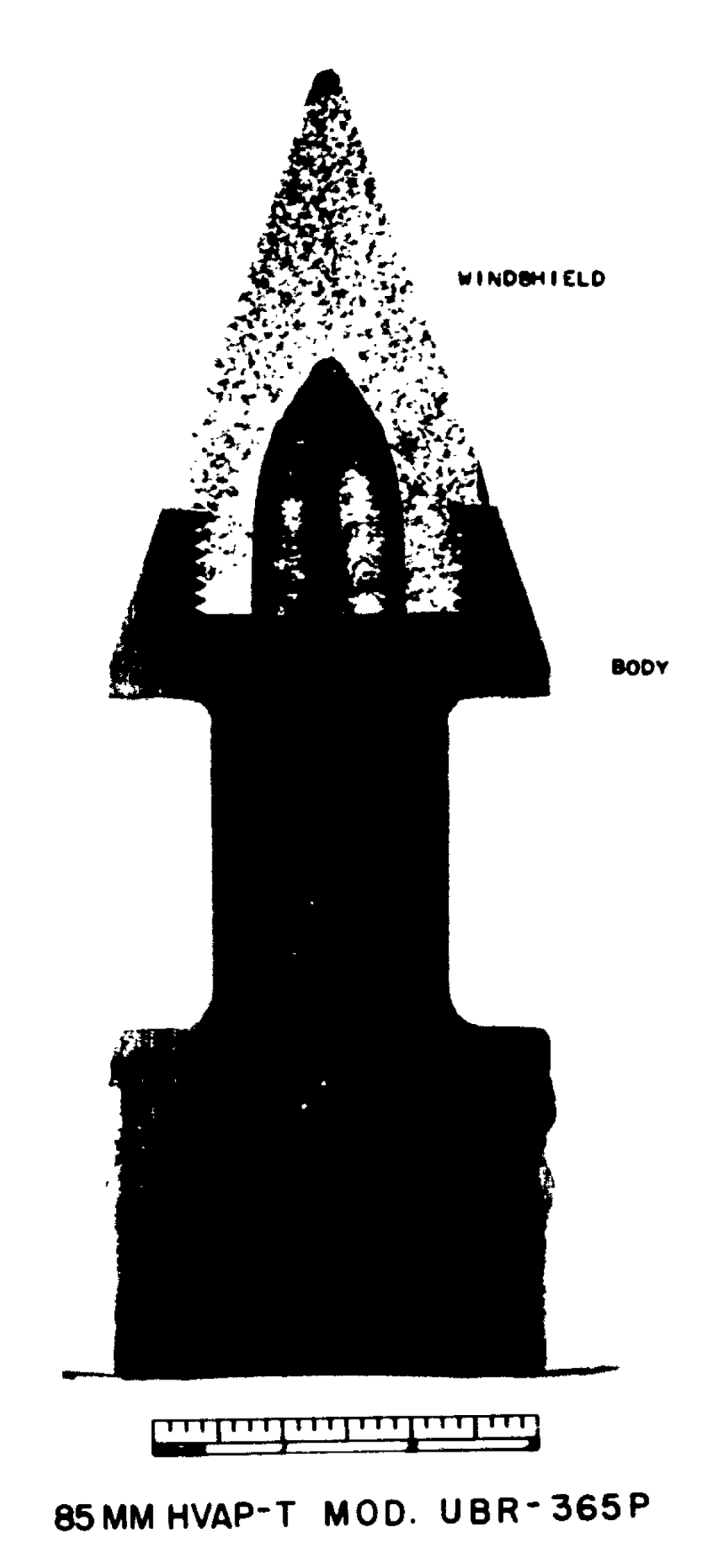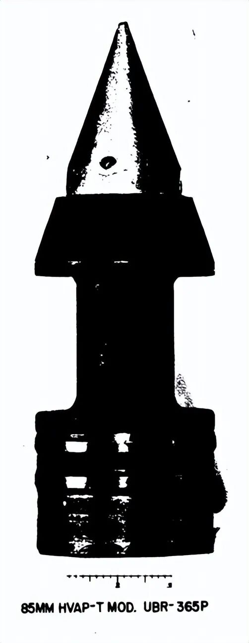 起初,D-44 师属炮配备的是二战时期的 UBR-365P 弹药,该弹种最早于 1944 年 2 月开始配发。其设计直接仿制了德国的 Pzgr. 40 穿甲弹,不仅延续了整体布局,连设计细节也一并保留,例如采用了实心砂铸铝制风帽;这与苏联其他采用空心钢制风帽的次口径穿甲弹(如 76.2mm 的 BR-354P)有所不同。然而,与德国的 “箭形” 硬芯穿甲弹(APCR)模式不同,由于苏联在生产高质量大型弹芯方面存在困难,其弹药改用了重量轻得多的碳化钨弹芯。