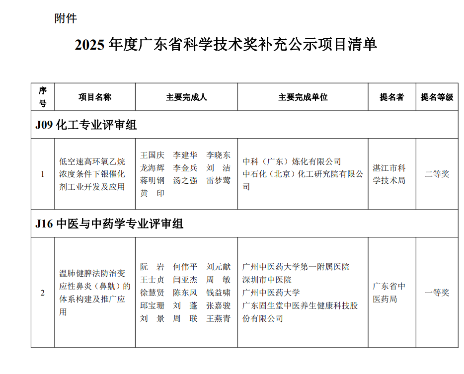 2026年2月24日—2026年3月5日,省奖励办对形式审查通过的自然科学奖、技术发明奖、科技进步奖、青年科技创新奖、科技成果推广奖共1537项在广东省科学技术厅公众网进行公示,期间收到部分项目提出异议,经复核,2项提名项目(具体名单见附件)符合相关规定,现予以补充公示。