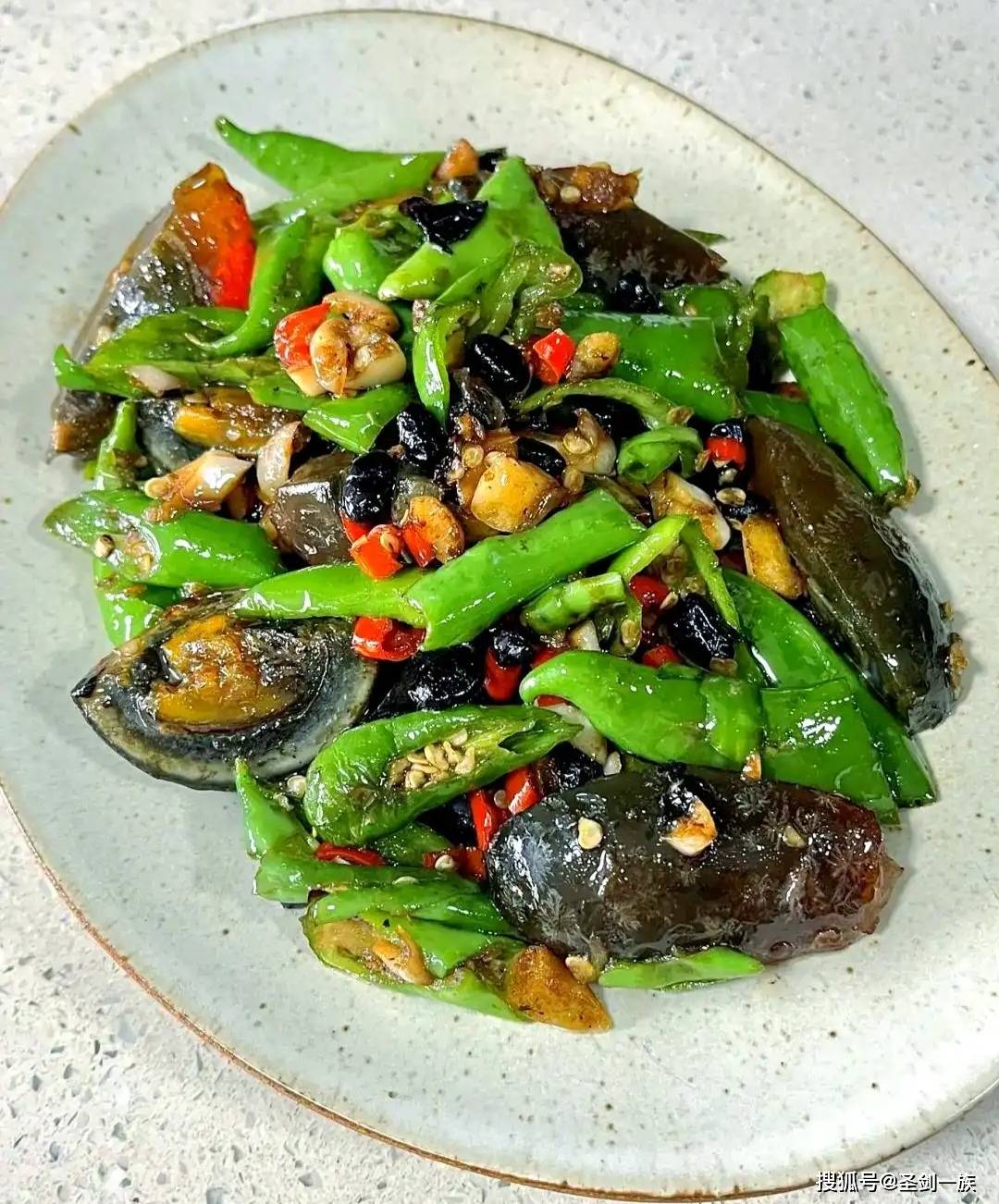 3. 留底油,爆香蒜末,放入青椒块炒至断生。