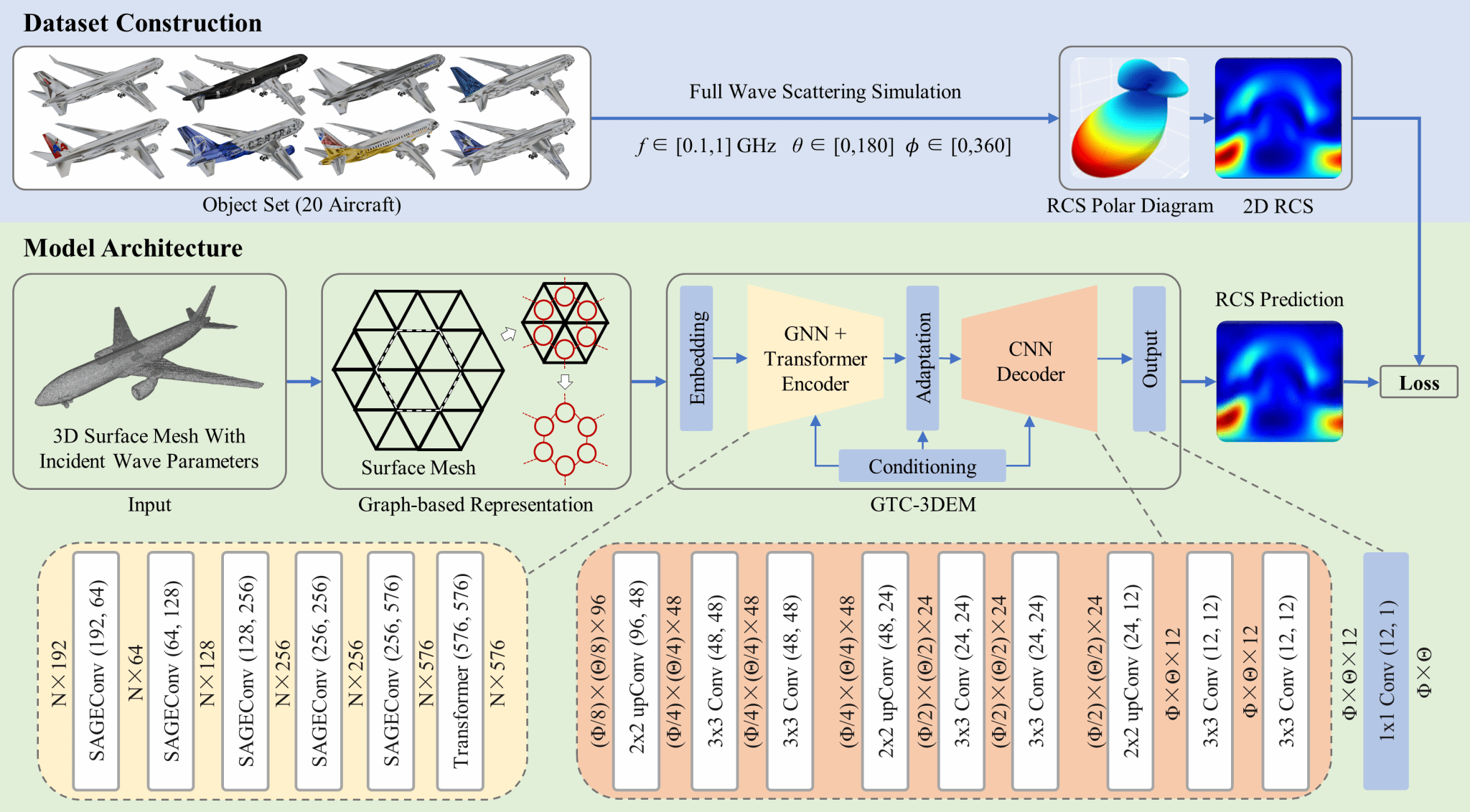 电磁散射特性(RCS)预测在飞行器隐身设计、雷达自动目标识别等领域具有重要意义。长期以来,如何平衡“计算精度”与“计算效率”是该领域的核心挑战。全波数值仿真(如矩量法MoM、有限积分法FIT)虽然精度高但计算成本高昂,难以满足现代工业设计中“快速迭代”的需求;而现有深度学习方法往往局限于二维场景或简单三维目标,几何泛化性较弱。