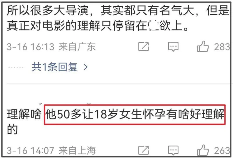 更有网友在评论区吐槽张艺谋本人,他的现任陈婷,也是因为在18岁时参加张艺谋电影海选,才认识了当时已经50岁的张艺谋,不会当年陈婷试戏的也是这个片段吧?