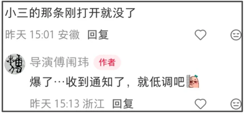 开个玩笑。后续傅闱玮的相关爆料视频已经删除了,他回复网友称是因为视频爆了,“收到通知了,就低调吧”,似乎是有人找上门要他删除内容。