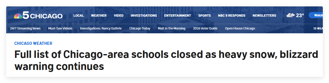 部分学校在降雪开始前的周日晚上已宣布停课。另一些学校则在周一上午大雪纷飞时发布停课通知,NBC频道风暴团队预警称预计将出现“持续数小时的强降雪”。