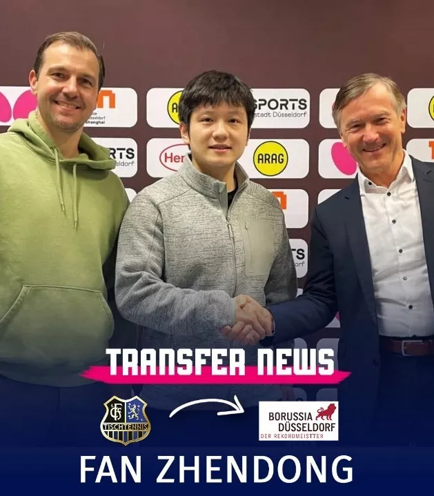 杜塞尔多夫俱乐部在第一时间,官宣了樊振东加盟的消息。球队称樊振东将于2026年7月1日正式加盟球队,双方签下了一份为期一年的合约。