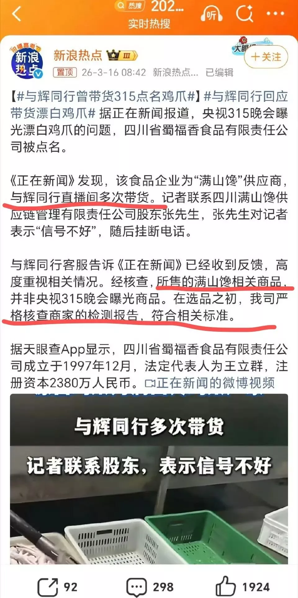 最可怕的是,这样的食品加工并非是小作坊,而是很知名的企业。媒体报道,与辉同行直播间曾多次带货这家品牌的鸡爪。当然,与辉同行对外的回应是带货的鸡爪不是央视曝光的这一批次的产品。就是说,虽然这家企业被曝光了,带的货也是这家企业的,但与辉同行带的货是好的,是合格的。