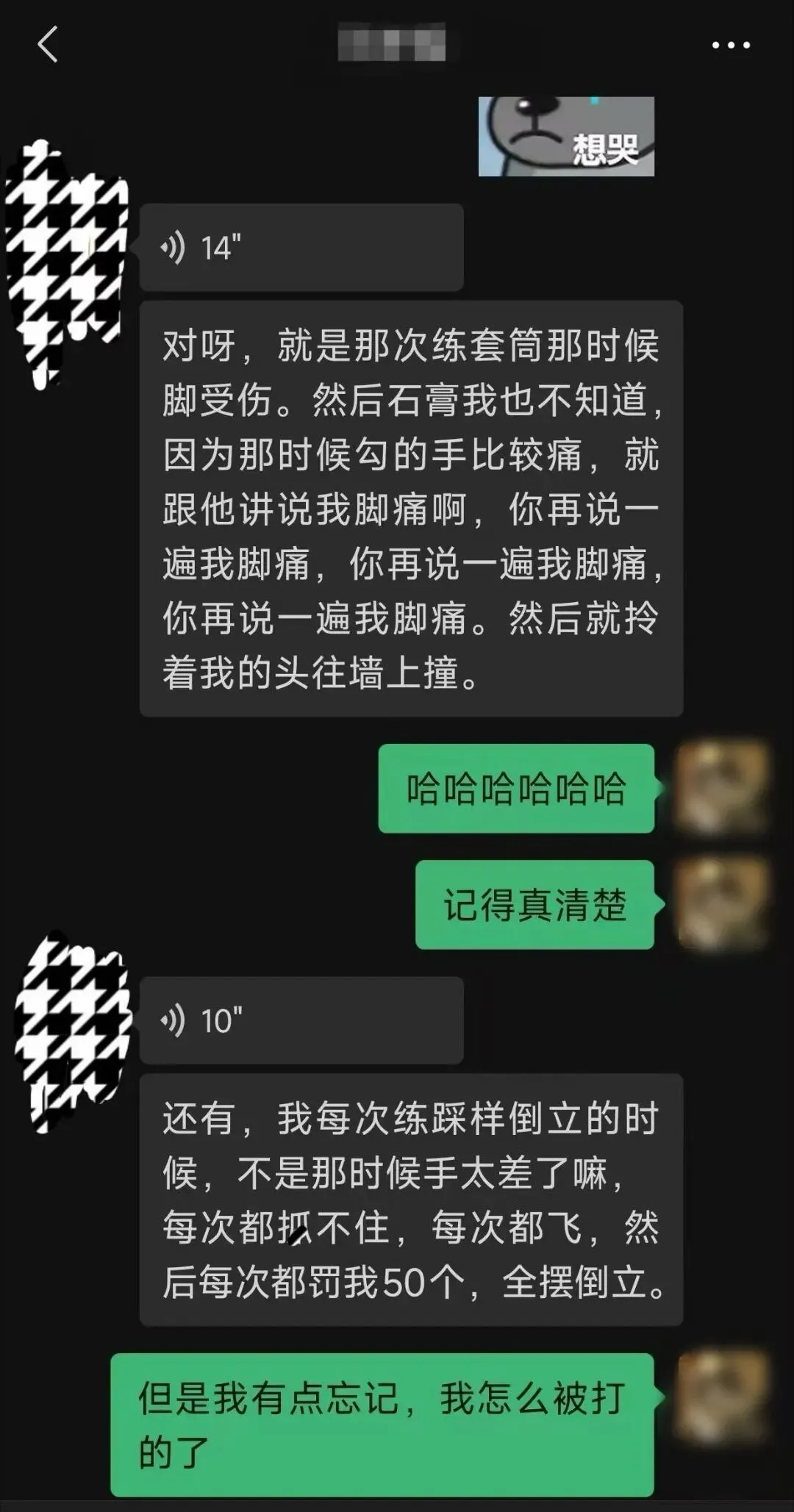 晋守宣向南风窗展示了一段微信聊天截图。对话显示,小佳曾通过“队友”试图回忆日常训练中被教练打骂的更多细节,这位“队友”提及,二人老是被教练扯头发、扇耳光,威胁“你再说一遍我脚痛”、拎着头往墙上撞等。