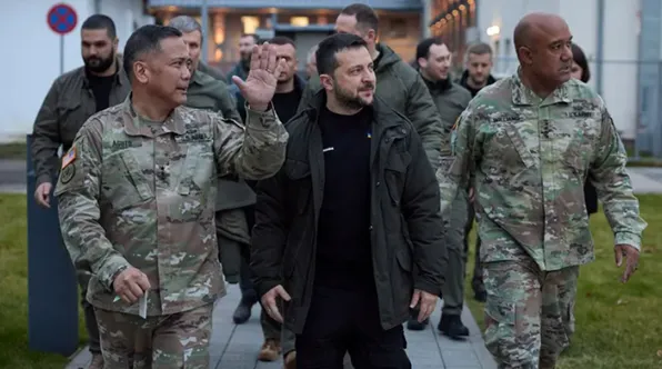 2023年12月14日,美国陆军少将安东尼奥·阿古托(左)与乌克兰总统泽连斯基在德国威斯巴登会面。 图源:英媒
