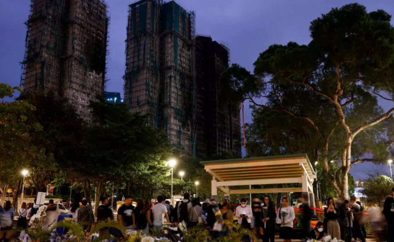 2025年12月2日,在中国香港大埔,人们聚集在汪福苑住宅楼旁的临时纪念碑前,摆放鲜花,悼念火灾遇难者。路透社/Maxim Shemetov TP REUTERS - Maxim Shemetov