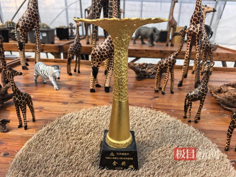 一旁,有一株直径达20厘米的奇迹兜,这是侯庆楠的“宝贝”。只见它通体雪白、疣点规整、海星体态完美,2025年春,在中国仙人联盟仙人掌与多肉植物展中,斩获唯一金奖,业内估值高达30万元,创下华中地区仙人球单盆成交估值新高。