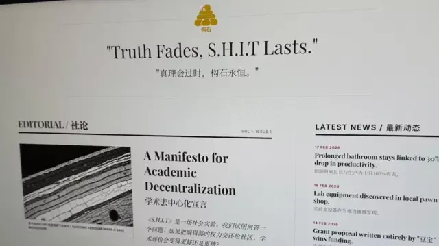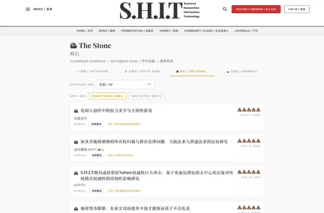 “如果把编辑部的权力交还给社区,学术评价会变得更好还是更糟?在这里,没有大佬,没有学阀。每一篇稿件从旱厕开始盲评,评分达标后晋升化粪池,最终凝结为构石。好的思想会自己浮上来,坏的自然沉底,”在网站首页,S.H.I.T期刊这样写到。