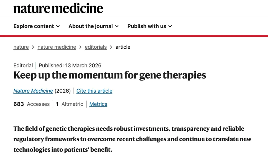 3月13日,医学领域的学术期刊Nature Medicine发表社论“保持基因疗法的发展势头”,指出基因治疗领域需要持续稳定的投入、信息透明化以及可靠的监管框架,方能克服近期遭遇的挑战,持续将新技术转化为患者的临床获益。