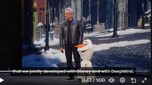 在演讲接近尾声时,一个机器人版的雪宝(Olaf)----迪士尼(Disney)《冰雪奇缘》(Frozen)系列动画中的雪人角色----缓步走上舞台。这个机器人由英伟达、DeepMind和迪士尼合作打造,它与黄仁勋进行了一段略显生硬的对话,话题围绕英伟达的Omniverse部门展开,该部门专门为机器人等设备开发物理AI产品。