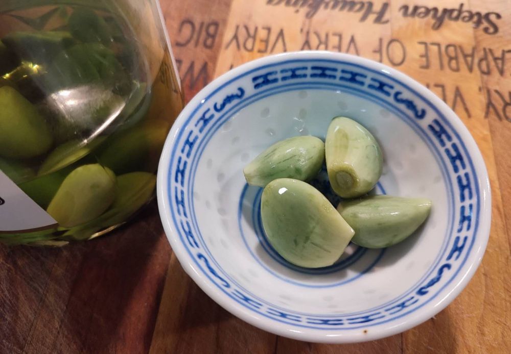 等到整坛蒜绿得通透、清清爽爽的时候,也就差不多成了。