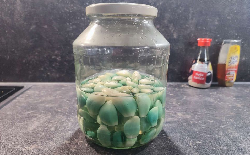 然后就把瓶子往屋里一放,找个避光的角落,静静待着。过不了几天,蒜瓣就开始变色。