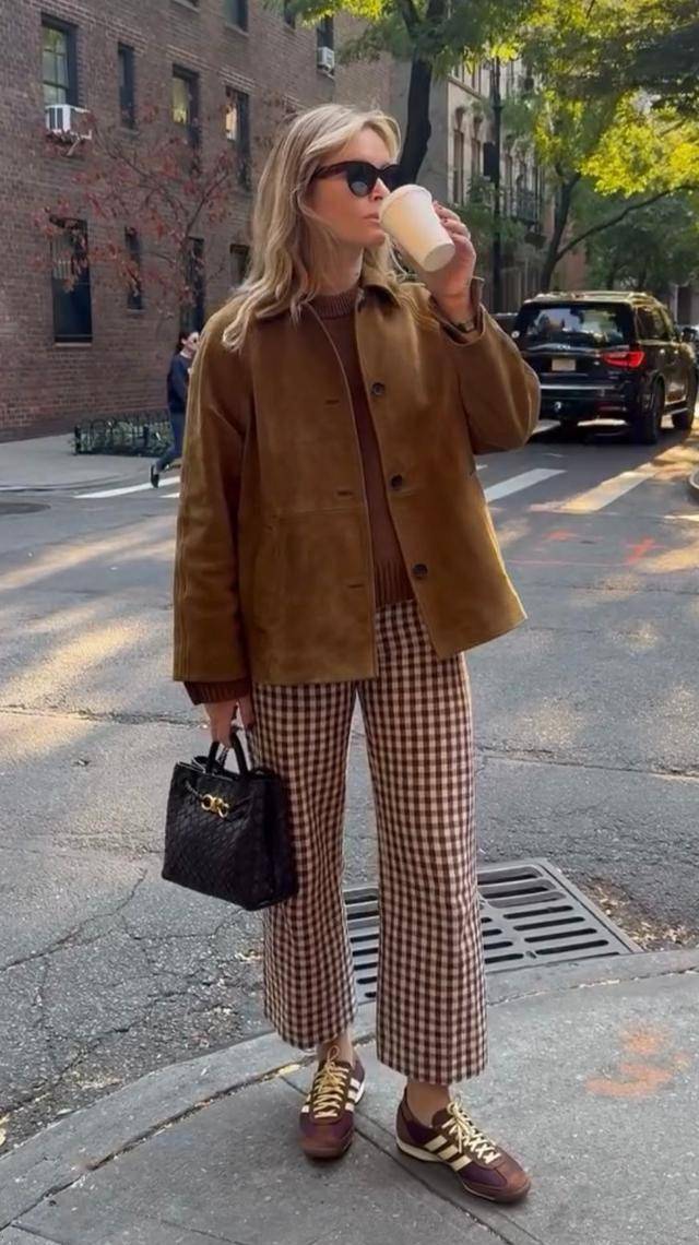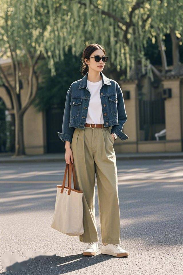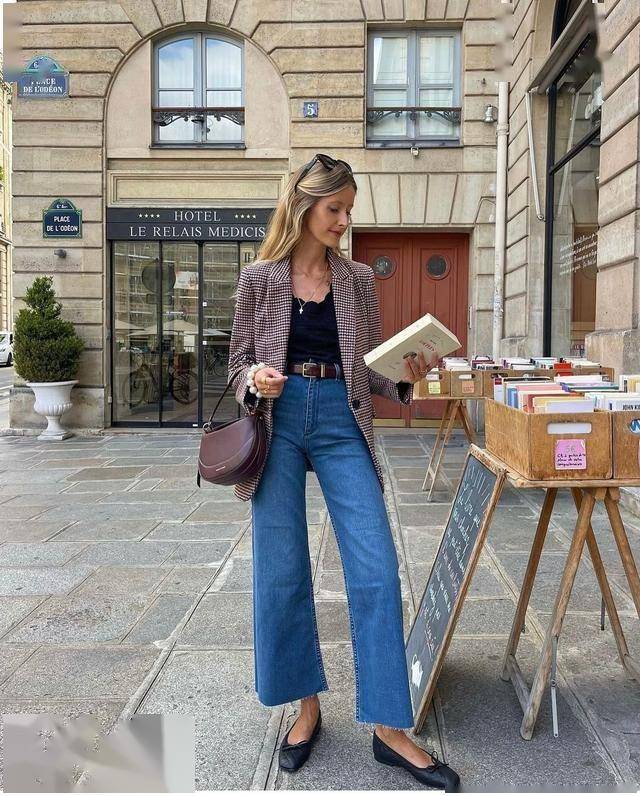 一条丹宁九分裤,天生自带复古滤镜,百搭又不挑身材,配双芭蕾鞋,裹上格纹西装,秒变“时尚女王”。
