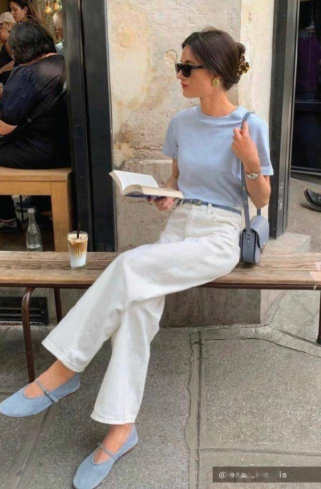 直筒九分裤和芭蕾鞋搭配,简约中透露着一丝精致感。