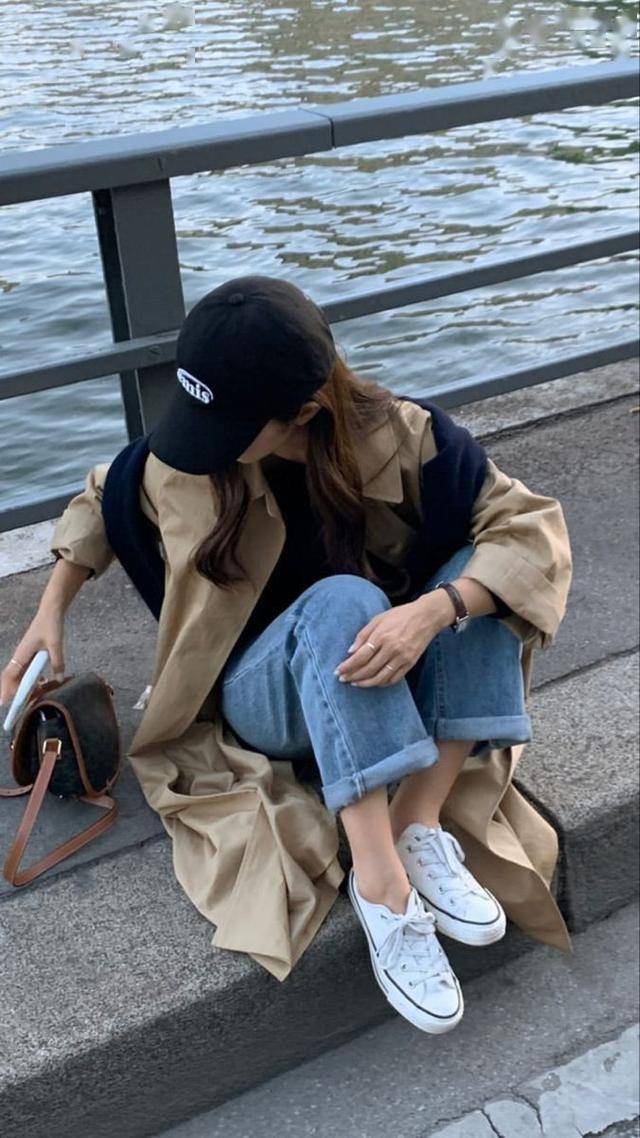 九分牛仔裤配卡其色风衣,挽起裤腿穿,平添一丝休闲范儿,再配双帆布鞋,拥有不费力的的松弛感。