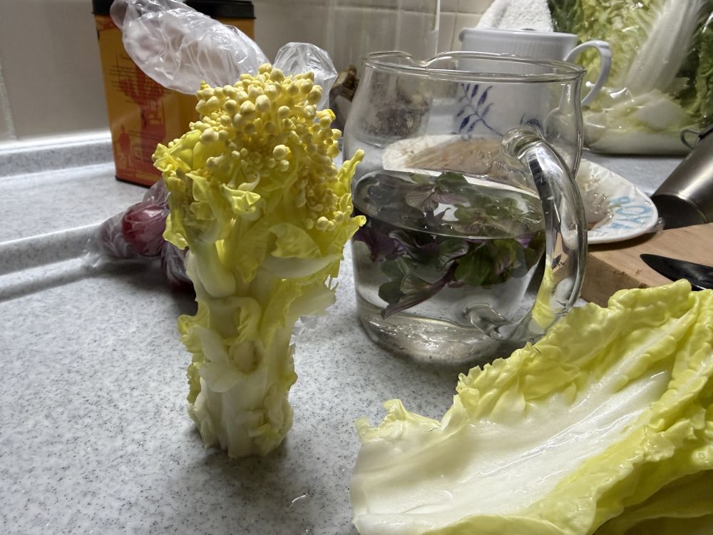 最里面的花芯儿,这个炒来吃也是很好吃的,当然也是嫩嫩的时候好吃,菜苔一类的都有点苦味儿,这个是植物种子的特色。所以越嫩的菜苔,越是好吃。旁边杯子里是泡的薄荷,也是今天早上放在蔬果汁里的。
