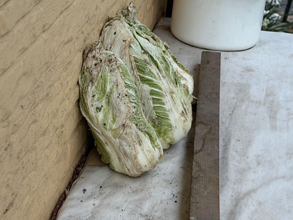 去年11越末收获的大白菜,晾晒几天后,在放在外面,冬季太冷的日子里,晚上会苫布挡风防冻,白天零上要打开苫布通风的。里面非常的好。