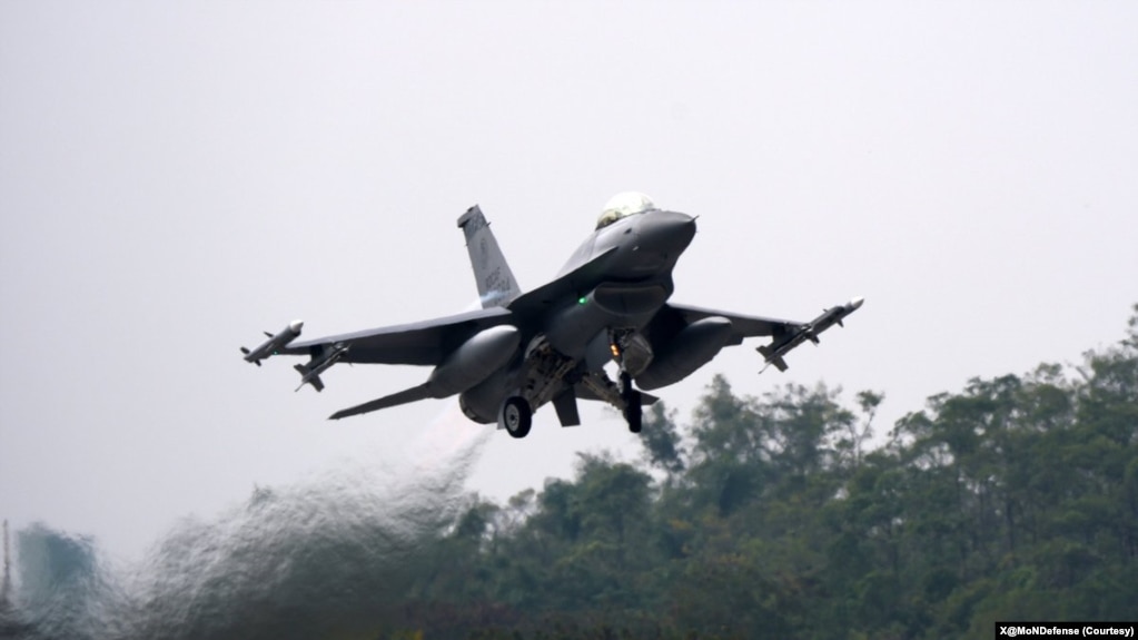 资料照片:2026年1月28日,在台湾嘉义举行的农历新年年度军事演习中,一架美制F-16战斗机起飞。