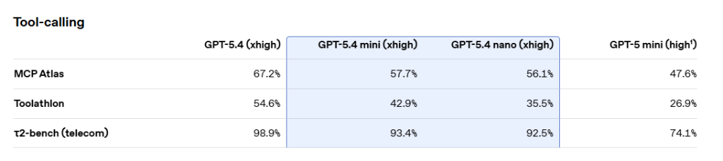 工具调用能力方面,GPT-5.4 mini在τ2-bench电信测试中得分93.4%,较GPT-5 mini的74.1%提升显著。在通用智能测试GPQA Diamond中,mini得分88.0%,nano亦达82.8%,均超越GPT-5 mini的81.6%。