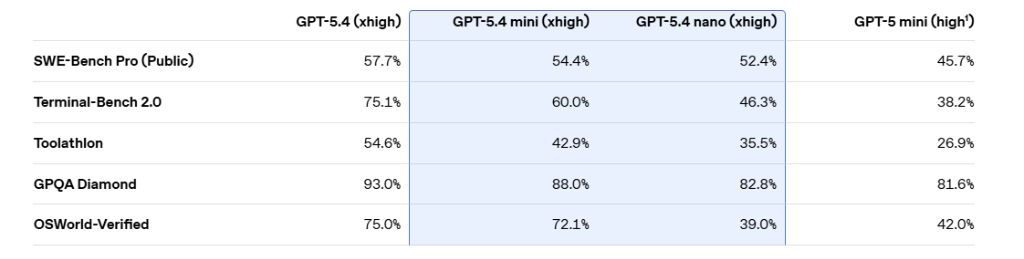 在计算机操控基准OSWorld-Verified上,mini以72.1%逼近GPT-5.4的75.0%,并大幅领先GPT-5 mini的42.0%。