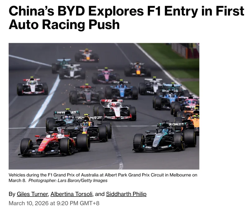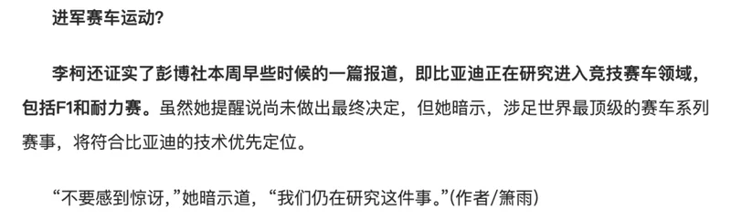 此前据彭博社报道,比亚迪内部近期正在评估进军顶级赛车赛事的可行性,包括但不限于F1、勒芒24小时耐力赛等,并且将优先选择以收购现有车队的方式作为入局路径。
