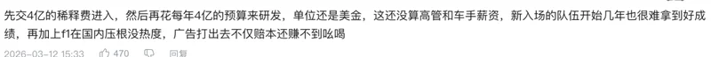 当然了,由于比亚迪在国内务实闷声卖车的形象实在过于深入人心,网友们普遍还是认为这事不太可能,毕竟要走F1这条路,先不考虑收购车队的天价成本,光是要支付给其他11支车队的入场稀释费就要4亿美元起,自建车队从零搭建符合F1要求的风洞系统、制造工厂、运营团队这块又是另一个既要有钱还要有人的故事。
