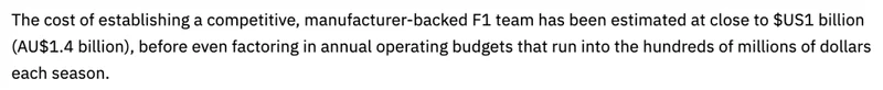 外国汽车媒体Drive推算,如今要组建一支有竞争力的F1厂商车队,光初始成本估计就接近10亿美元,这还不包括每个赛季数亿美元的年度运营预算。
