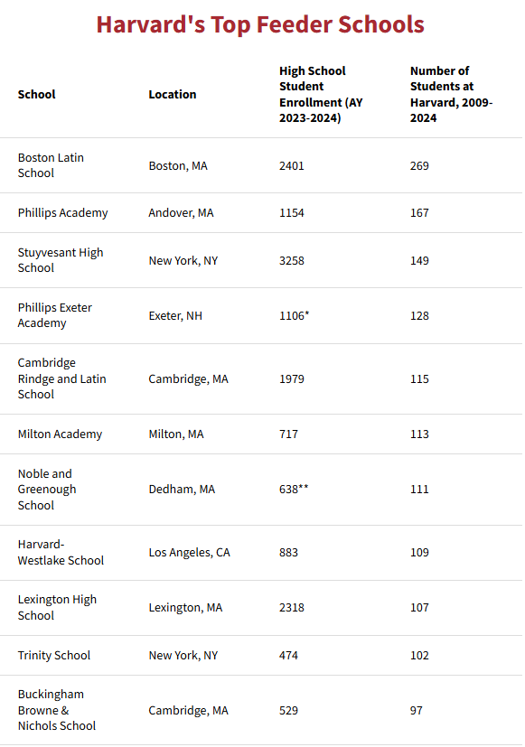前不久,Harvard Crimson 公布了大学的“feeder school”,即常年稳定向哈佛大学输送生源最多的前20所高中。