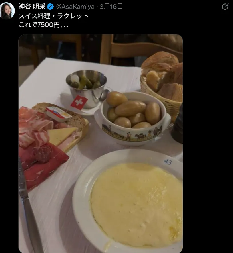 “在瑞士旅行时,仅仅一份麦当劳的咖啡加沙拉就花费了2400日元,一顿普通奶酪料理更是高达7500日元!”