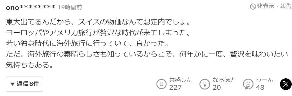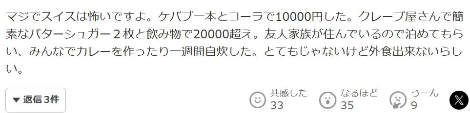 “说真的,瑞士太可怕了。一个卷饼加一瓶可乐就要一万日元。在可丽饼店点了两张最简单的黄油砂糖可丽饼加饮料,直接超过两万日元。因为有朋友一家住在那里,就住在他们家,一起做咖喱,一周都在自己做饭。不然真的完全吃不起外食。”