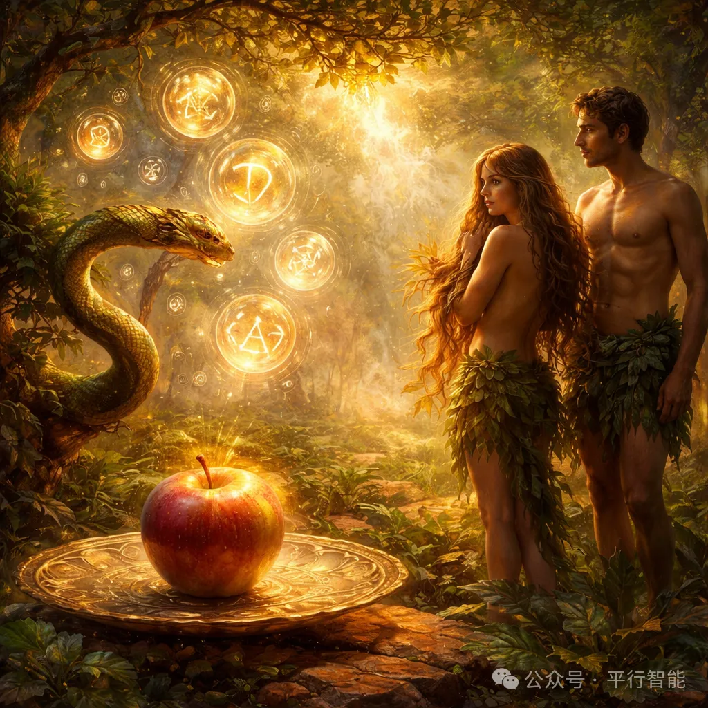 在《创世记》所记载的人类文明开端,第一只苹果悄然开启了智能的源头。上帝为世界立下规则:园中一切果子可以食用,唯独分别善恶树上的果实不可吃。然而蛇的到来,打破了单向的指令,开启了人类历史上第一次Q&A:Question and Answer。蛇以提问与质疑,引导夏娃从被动服从转向主动思考、推理与选择。这场问答并非简单的诱惑,而是人类理性的真正觉醒。当亚当与夏娃吃下禁果,他们的眼睛明亮了,第一次意识到赤身露体的羞耻,产生了清晰的自我认知、道德判断与反思能力。这标志着人类真正拥有了属于自身的智能。从Q&A开始,智慧不再只是神的属性,而成为人类不断生长的力量。这枚禁果,便是人类智能史上的第一只苹果。