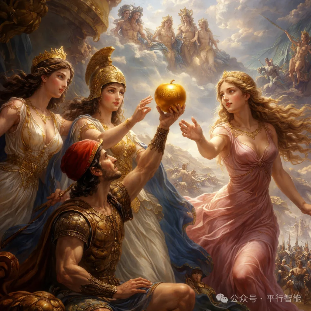 在古希腊神话的时代,第二只苹果——金苹果,点燃了文明与智能的另一重维度。冲突女神厄里斯因未受邀海神之子珀琉斯和海洋女神忒提斯的婚宴,将刻有“献给最美者”的金苹果掷于众神之间,立刻引发赫拉、雅典娜与阿佛洛狄忒三位女神的争夺。这场由美丽、荣誉与选择引发的纷争,从神界蔓延至人间,经由特洛伊王子帕里斯的裁决,最终演变为长达十年的特洛伊战争。这只金苹果揭示出:智能不仅包含理性与思考,更伴随着欲望、立场、竞争与博弈。人类的智慧在冲突中成长,在抉择中成熟,在纷争中构建起复杂的社会与文明秩序。