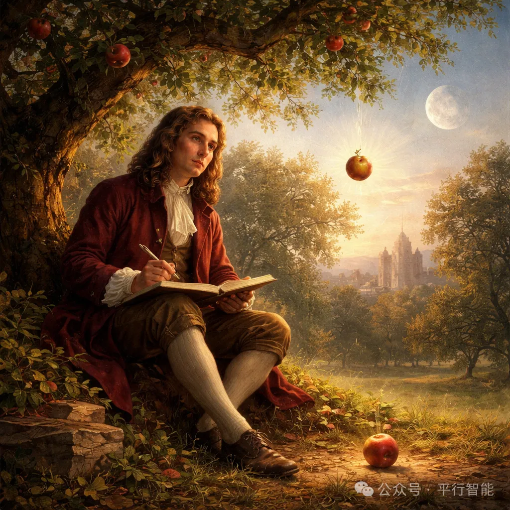 时间来到1666年,因伦敦瘟疫蔓延,牛顿回到家乡林肯郡休养。一只苹果从树上坠落,触发了他对宇宙规律的深刻思考:苹果为何落地,而月亮却不会坠落?这一朴素的观察,催生了万有引力的思想,开启了人类用数学、逻辑与实验解释世界的科学时代。从神话与思辨,转向观察、推理与验证,人类第一次系统掌握了认识自然的科学方法。这只落地的苹果,让智能从主观想象走向客观规律,为现代科学、工程技术乃至人工智能的诞生,奠定了最坚实的理性基础。