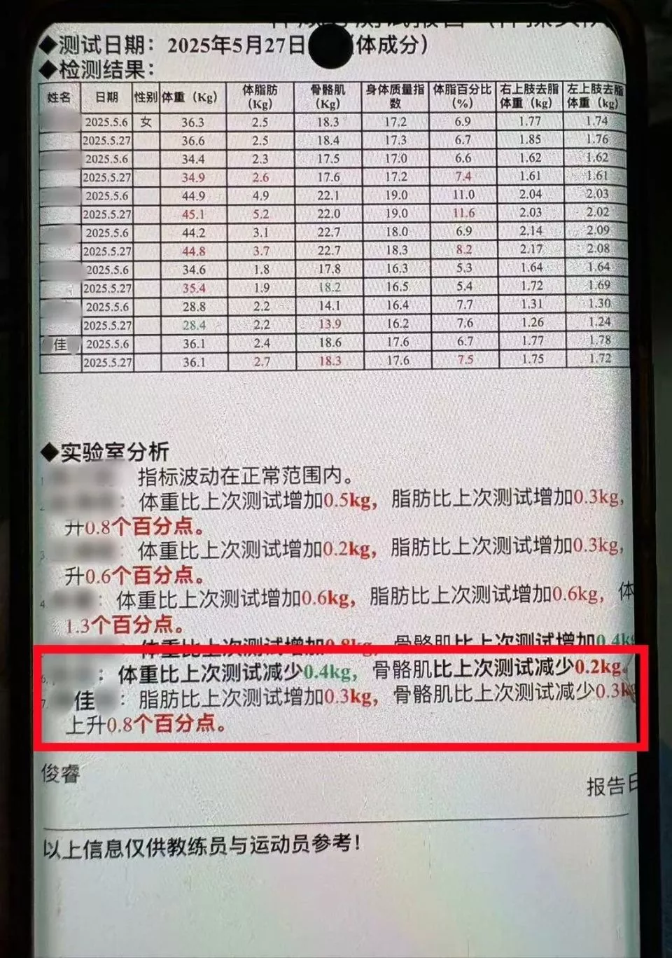 13岁的小佳,身体处于生长发育期。南风窗注意到,在2025年5月的体重检测报告中,时隔21天,7名运动员当中,包括小佳在内,5人出现了体重或脂肪增加。而唯一体重减轻的运动员,骨骼肌减少。