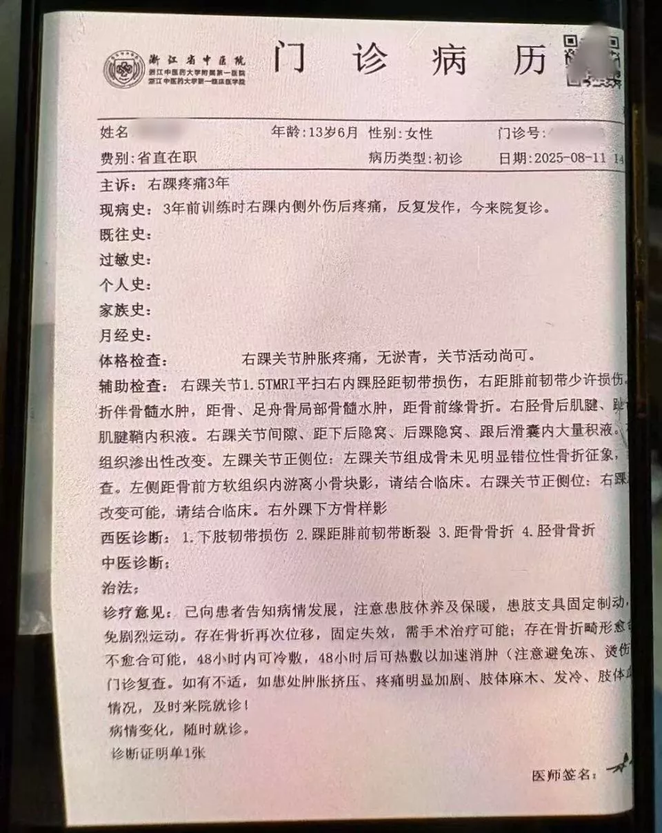 浙江省中医院2025年8月11日出具的病历诊断显示,小佳下肢韧带损伤、踝距腓前韧带断裂、距骨骨折、胫骨骨折——距骨、胫骨、腓骨共同组成踝关节,是人体最大的负重关节。诊疗意见写着:“患肢支具固定制动,避免剧烈运动,存在骨折再次位移、固定失效、需手术治疗可能。存在骨折畸形愈合、不愈合可能。”