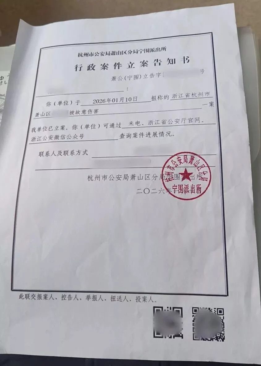1月,晋守宣以“故意伤害”向警方报案,公安局已行政立案。